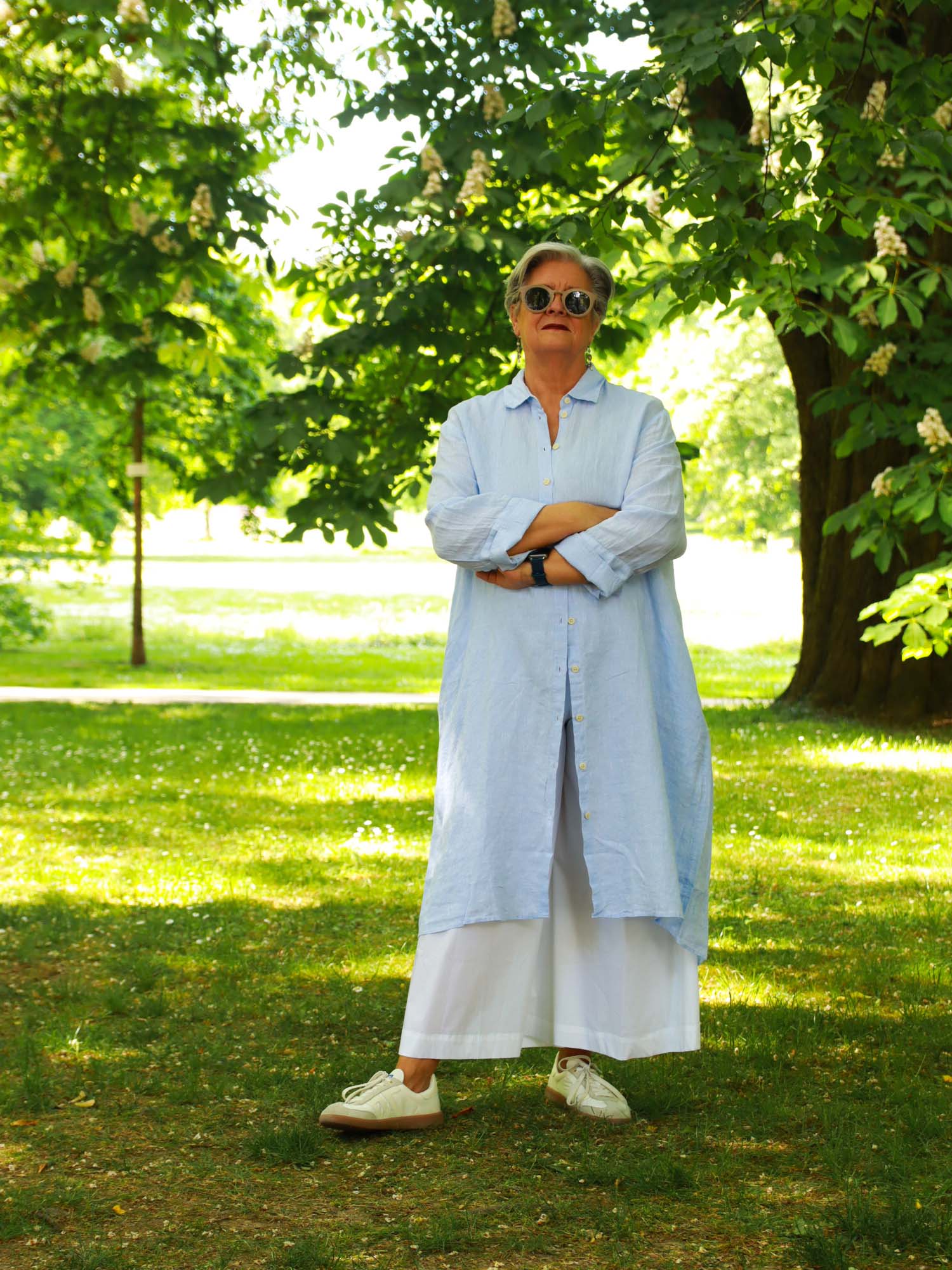 Fil Noir: Lässiges Hemdblusen – Leinenkleid, durchgeknöpft, Große Manschetten, Langarm, Seitentaschen. Material: 100% Leinen.
