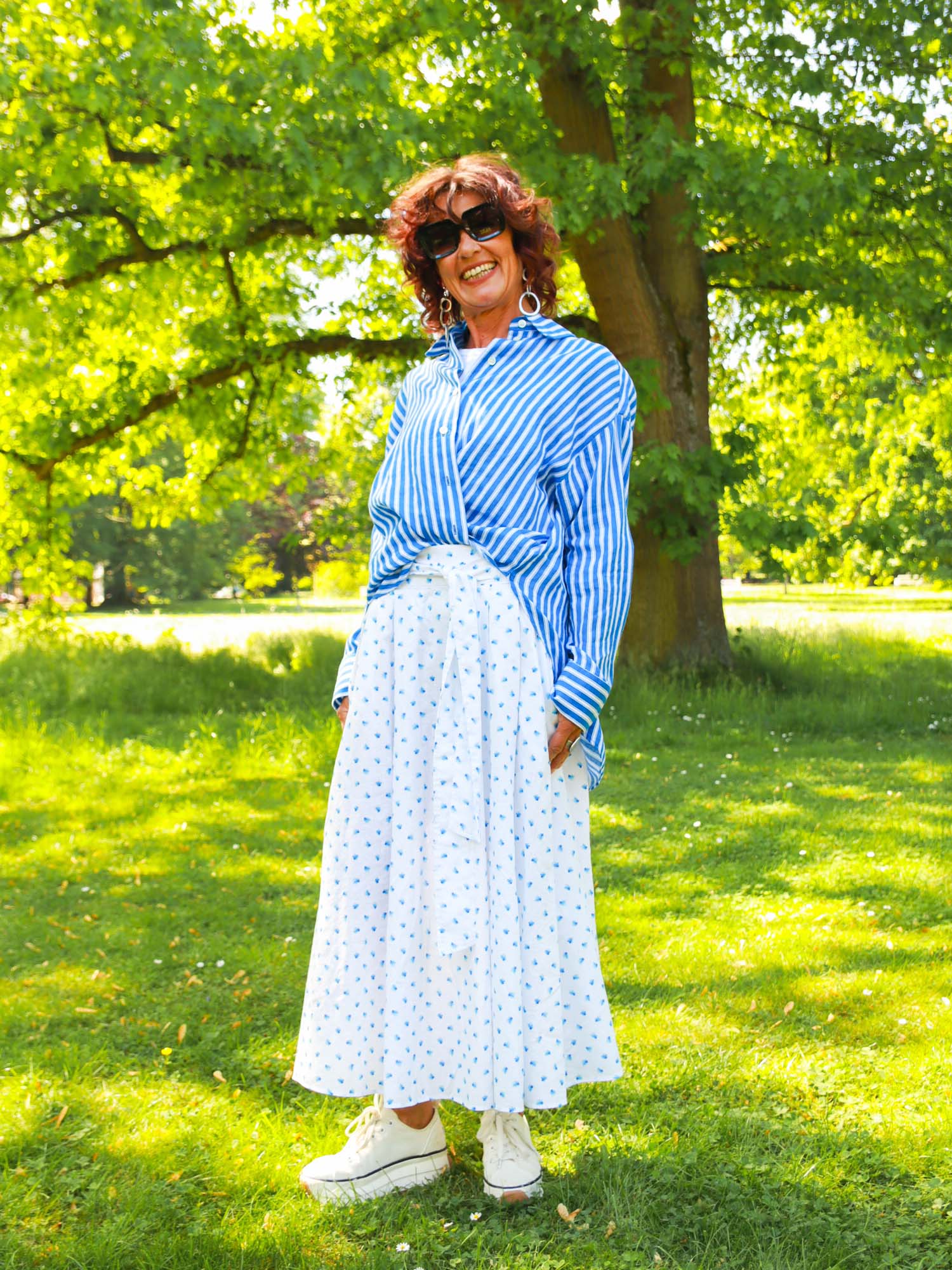 Fil Noir: Lässiger Leinenrock in weiß mittürkisen Blümchen, ausgestellt, Midilänge, seitl. Taschen, passender Bindegürtel. Material: 100% Leinen.